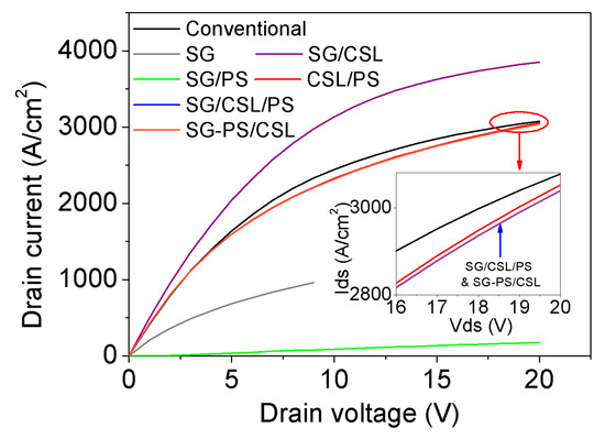 Figure 2 summarizes the simulated on-state characteristics of the SiC UMOSFET structures at room temperature. As can be observed, both structures without CSL exhibit much higher on-state resistances than that of the conventional structure, indicating that, in fine cell pitch structures, current spreading is important, especially when there is a parasitic JFET effect by PS and P-well. The specific on-resistance of the SG/CSL/PS structure and the proposed SG–PS/CSL structure is 2.33 mΩ-cm2 at Vgs = 20 V, comparable to that of the conventional structure. For SG/CSL, the specific on-resistance can be further reduced to 2.00 mΩ-cm2 since therefore is no PS and therefore no JFET effect. However, this structure suffers from other effects, as shown in the next discussion.