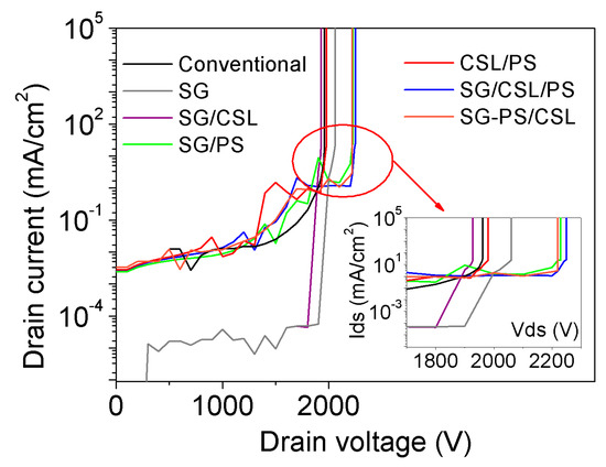 The reverse blocking characteristics between different gate designs. The breakdown voltages of the proposed SG–PS/CSL and SG/CSL/PS structure is 2250 V. © (2020) IEEE. Reproduced, with permission, from [14].