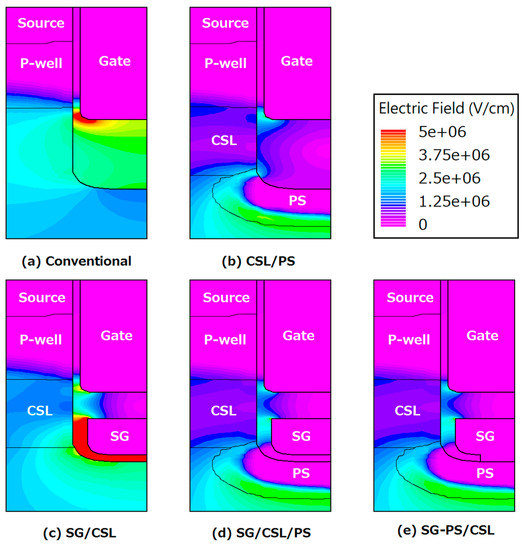 The electrical field distribution in different gate designs at Vds = 1600 V. The devices without PS (a,c) show a relative high electric field at the gate trench bottom corner. In simulation, P-well and SG are connected to the source electrode through virtual contacts at locations indicated in Figure 1. (a). Conventional; (b). CSL/PS; (c). SG/CSL; (d). SG/CSL/PS; (e). SG-PS/CSL.