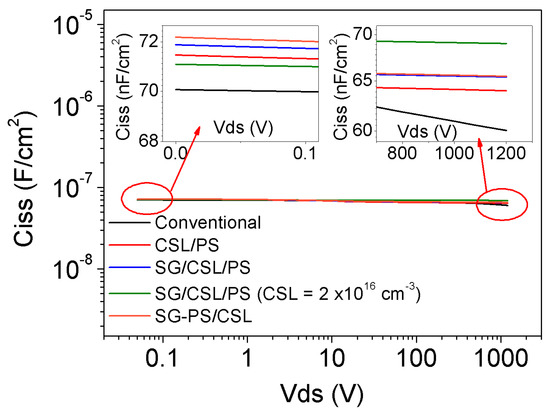 Ciss of conventional, CSL/PS, SG–PS/CSL, and SG/CSL/PS, with different CSL doping concentrations. The frequency is at 1 MHz and Vgs is 0 V. If not otherwise specified, the CSL doping concentration is 9 × 1016 cm−3.