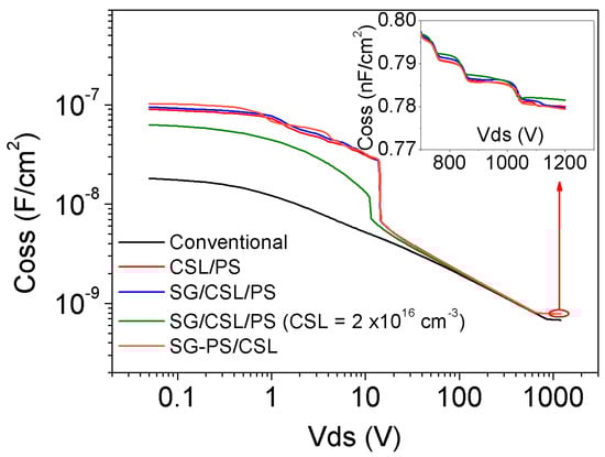 Coss of conventional, CSL/PS, SG–PS/CSL, and SG/CSL/PS, with different CSL doping concentrations. The frequency is at 1 MHz and Vgs is 0 V. If not otherwise specified, the CSL doping concentration is 9 × 1016 cm−3.