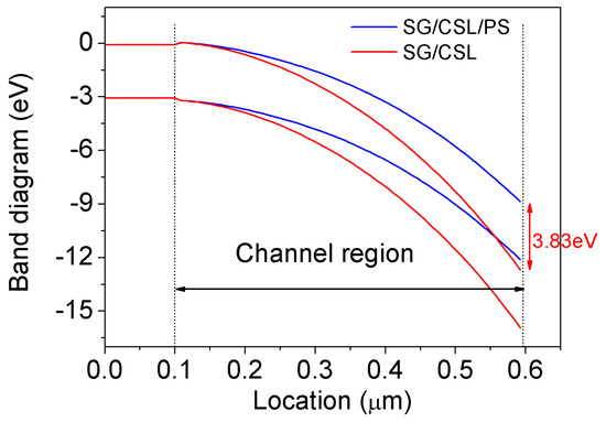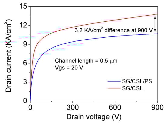 The short-circuit capability of power-switching devices is of great importance, particularly for motor-drive applications. In this section, we discuss the importance of the PS region to the short-circuit capability of 4H-SiC UMOSFETs. A common approach to reduce channel resistance in 4H-SiC MOSFETs is to use submicron channel length, where short channel effects are inevitable [19,20]. In Figure 9, simulated Id-Vds curves in the saturation region of SG/CSL and SG/CSL/PS are compared. A channel length of 0.5 μm is used. It is clear that the insertion of PS can reduce the saturation current in the high Vds regime and therefore improve the short-circuit capability, which is limited by thermal constrains [21,22]. A band diagram along the vertical channel is plotted in Figure 10, when Vgs is 20 V and Vds is 900 V. With the PS region, the channel is shielded from the drain potential, even at such high drain bias, and therefore the channel length modulation, as well as the drain-induced barrier lowering (DIBL) effect in the device is relieved This reduces the saturation current and power dissipation during short-circuit duration, similar to what has been reported for silicon IGBT [23,24].