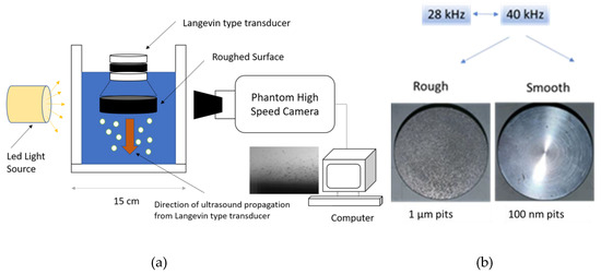 The schematic of the experimental setup is shown in Figure 1. A cubic pool made of the glass with dimensions of 15 × 15 × 15 cm3 was used for visualization of the cavitation experiments. The working fluid was chosen as water. A Langevin type piezoelectric transducer, which generates mechanical movements from electrical signals, was operated at frequencies of 28 kHz and 40 kHz. Mountable disc surfaces with a diameter of 40 mm and different surface roughness values (of 100 nm and 1 µm) were utilized to investigate the effect of surface roughness at the applied frequency of 40 kHz (shown in Figure 1b). Roughness on the surface was achieved with a sandpaper. The transducer was fixed at the top of the pool. A high-speed camera, which allows for fast recording of the videos and snapshots of the bubbles during acoustic cavitation phenomena with exposure time of 2 µs, frame rate of 10,000, was used for visualization. The visualization was achieved using the Shadowgraph Imaging Technique.