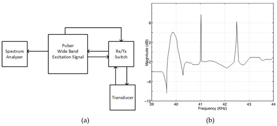 The sandwich-type transducers are used inside many industrial devices and are well characterized [46,47]. The transducer usually has a single operating band, which has a fractional bandwidth of around 5%. The operation frequency band was investigated using the experimental setup depicted in Figure 2a. A pulse generator (5072PR, Olympus CO. Waltham, MA, 02453, USA) excited the transducer using a wideband pulse, and the received echo was measured by a spectrum analyzer (DSA875, Rigol, Beaverton, OR 97008, USA). The measure response showed a narrow band characteristic with an operating frequency of 39.85 kHz (Figure 2b). The setup was used to determine the exact operating frequency so that the transducer could be driven effectively.