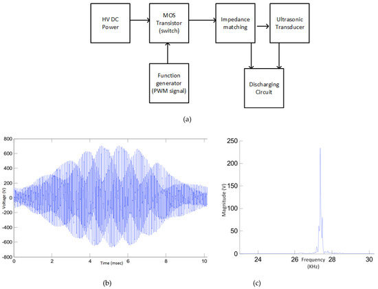 The designed driver circuitry was able to set the desired frequency and power level. The circuit was controlled by a digital signal in order to provide frequency stability. Unlike the usual design, a single switch was employed in the design. The high voltage switch pumped the electrical power to the transducer by a predefined frequency. The switch was a metal-oxide semiconductor (MOS) transistor connected to a high voltage direct current (HV-DC) supply, which was provided from rectified alternating current (AC) voltage (220 V RMS). In the design, only a single switch was used. It charged the piezoelectric transducer during on-time, and the accumulated charge was discharged in off-time. The main component was inversely positioned fast diodes in the discharging circuitry. Hence, only one switch was used to simplify the excitation circuit of the MOS transistor. A simple function generator applied the pulse width modulated (PWM) signal to operate the system. The duty cycle of the PWM signal defined the power (duty cycle must be under 40%), and the PWM frequency determined the transducer’s operation point. The block schematic explaining the circuit design is given in Figure 3a. The voltage across transducer nodes can be seen in Figure 3b, and the frequency domain representation of the voltage shows that the transducer is actuated by a pretty narrow band signal around the required frequency (Figure 3c).