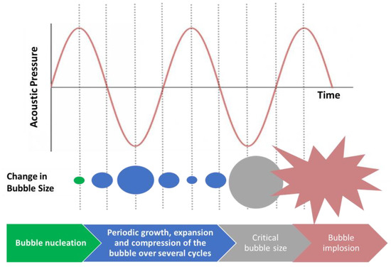 When appropriate ultrasonic radiation is applied, “multi-bubbles” appear in a liquid medium. The generated bubbles can be formed due to either the existence of the dissolved gas nuclei or the caged gases in the solid particles. Another reason for the formation of bubbles can be attributed to the separation of larger bubbles in the liquid medium. Theoretically, if the bubble overcomes the pressure threshold, which is called the Blake threshold, PB, (Equation (5)), nucleation takes place [1]: