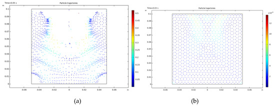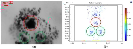 To provide further understanding about the effect of acoustic field on bubble dynamics, numerical modeling was performed using the COMSOL® software (Burlington, MA 01803 USA) [49]. According to the experimental results shown in Figure 7a, locally grouped bubble clouds in the liquid are visible. This behavior can be also recognized in simulated air particle trajectories shown in Figure 7b. According to the comparison between experimental and numerical results, almost the same bubble distribution can be achieved.