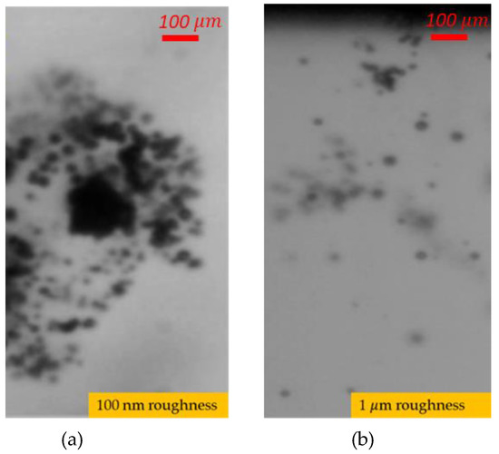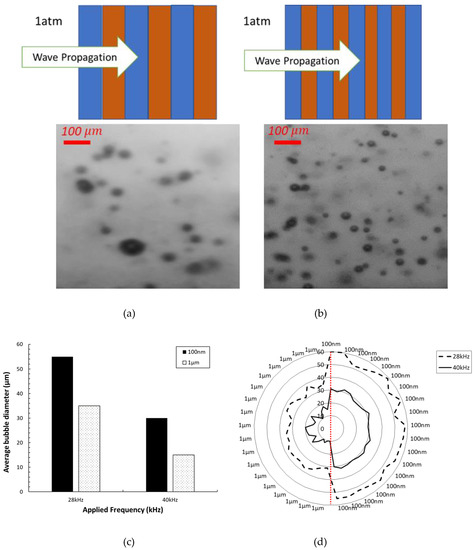 As seen in Figure 11a, there are approximately 20 bubbles, whereas 50 bubbles are visible on the same scale in Figure 11b. The average size of generated bubbles under the 40 kHz acoustic field is almost twice as much as the size of generated bubbles under the 28 kHz acoustic field. As the size of bubbles increases, the generated energy due to bubble collapse remarkably decreases. Furthermore, as can be seen in Figure 11c, surface roughness reduces the bubble size. The main reason is the propagation angle of surface acoustic wave propagation. As surface roughness increases, surface wave propagation occurs with lower velocity, and scattering increases, thereby weakening the wave.