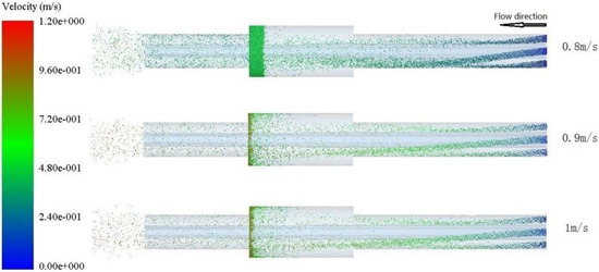 As indicated in Figure 4, when the drilling fluid velocity is 0.8 m/s, a large number of particles are accumulated on the left. When the drilling fluid velocity increase to 0.9 m/s, the particles are piled on the left side have been significantly reduced. When its rate reaches 1 m/s, the number of particles packing is basically the same as that of particles at 0.9 m/s.