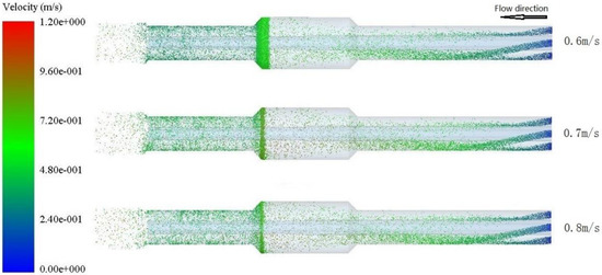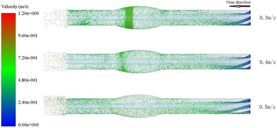 In Figure 6, when the drilling fluid velocity is 0.3 m/s, large quantities of particles are accumulated on the left under arc expansion. When the drilling fluid velocity increases to 0.4 m/s, the volume of the left part is greatly reduced. When its rate reaches 1 m/s, there is substantially no particle accumulation at arc expansion section.