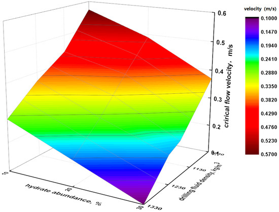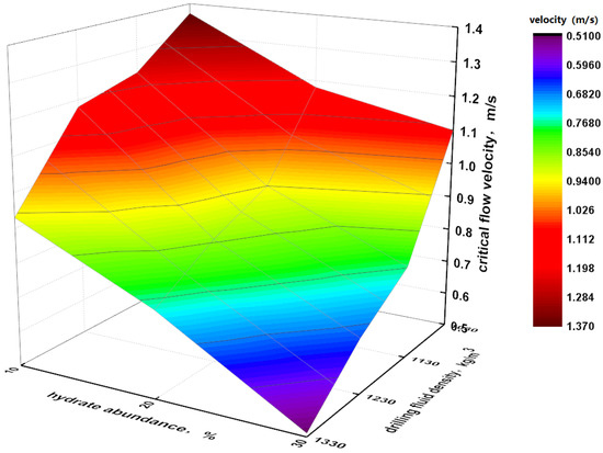 The critical flow velocity plate of different hydrate abundance and drilling fluid density under arc expansion.