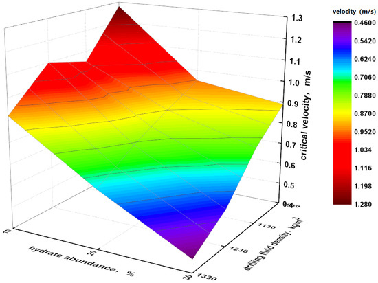 The four drilling fluid densities of 1030 kg/m3, 1130 kg/m3, 1230 kg/m3 and 1330 kg/m3 are respectively simulated under the condition of the hydrate abundance of 10%, 20% and 30%, that is, each hydrate abundance value should be simulated for the corresponding four drilling fluid densities. The critical flow velocity plate could be obtained as shown in in Figure 10, Figure 11 and Figure 12 respectively under three different hole enlargement ways.