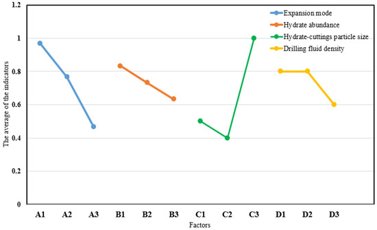 In order to judge intuitively, the factors influencing are used as the abscissa, and the average value of the index are used as the ordinate according of the data in Table 2. Then, the trend chart of the influence of various factors is drawn on critical flow velocity of carrying cuttings, as shown in Figure 13. When comparing Ki values, the minimum Ki level is taken as the optimal level. Among them, Ki is the sum of indicators and data of repeated tests at all levels; ki is the average of the indicators.