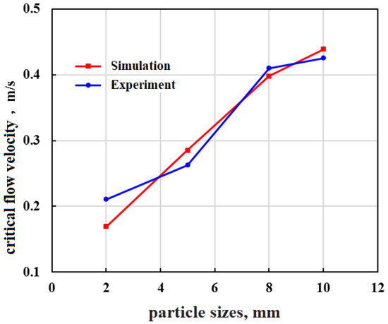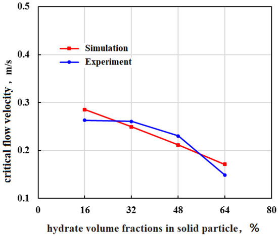 It can be seen from Figure 14, with the increase of solid particle size, the critical starting flow velocity increases. The numerical simulation results are consistent with the experimental results that the error is less than 9.62%. From Figure 15, with the increase of volume fraction of hydrate in solid particles, the critical starting flow velocity decreases. The numerical simulation results are consistent with the experimental results that the error is less than 8.52%. By comparing the numerical simulation with the experiment, the accuracy of the establishment of the critical flow velocity plate of marine gas hydrate is verified.