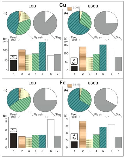 - Compared to feed coals, the elements strongly enriched in fly ash resulting from its combustion from the LCB are Ag, Co, Cu, V, and W, and the coal constituting the feed coals from the USCB is Ag, As, Bi, Cd, Co, Cu, Fe, Mn, Mo, Pb, Sb, V, W, and Zn. Elements strongly enriched in slag are V (LCB) and Ag, Bi, Cd, Co, Cu, Fe, Mn, V, and Zn (the USCB). Elements depleted or absent in fly ash are Bi, Cd, Cr, Fe, Mn, Mo, Sb, and Sn (the LCB), and in slag they are Ag, As, Bi, Cd, Cr, Fe, Mn, Mo, Ni, Pb, Sb, Sn, W, and Zn (the LCB) and As, Mo, Sb, Sn, and W (the USCB).
