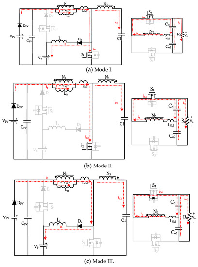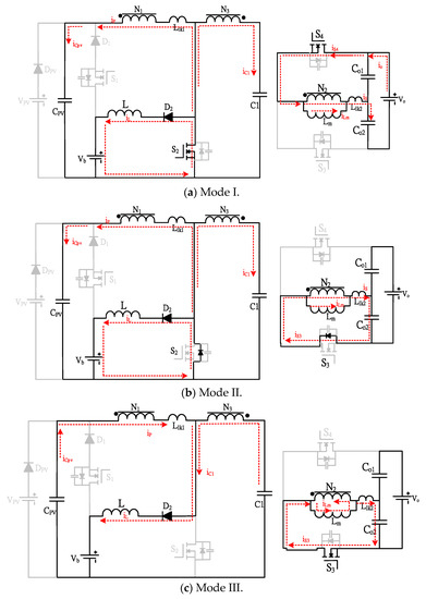 As shown in Figure 8a, in this mode, the switch S4 and switch S2 are turned on for synchronous rectification, the other switches are turned off, and the diode D2 is turned on. The voltage of the dc bus stores energy in the magnetizing inductance Lm and charges the output capacitor Co2. The energy induced by the transformer charges the solar input capacitor CPV through the winding N1 and charges the capacitor C1 through winding N3. The charging inductor L is discharged to the battery through the switch S2.