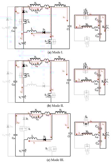 As presented in Figure 4b, in this mode, the switches S2 and S4 are turned on, the other switches are turned off, and the diode D2 is turned off. The circuit operates in the same manner as in Mode I. The PV module voltage VPV continuously stores energy in the magnetizing inductance Lm, charges the capacitor C1 through the third winding, and simultaneously transmits the energy to the secondary side and charges the capacitor Co1 through the switch S4. The output capacitors Co1 and Co2 supply energy to the load Ro.