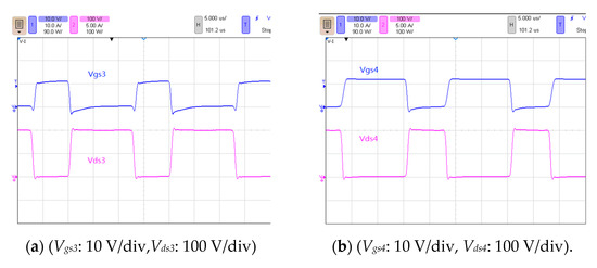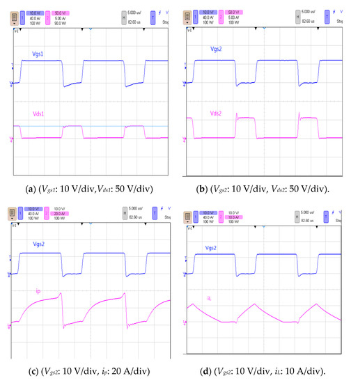 Figure 14 illustrates the measured waveforms of each component in Stage 3 at full load. Figure 14a shows the switch S3 waveform of the control signal Vgs3 and switching voltage Vds3, and the switching voltage stress is approximately 200 V. Figure 14b shows the switch S4 waveform of the control signal Vgs4 and switching voltage Vds4, and the switching voltage stress is nearly 200 V. Figure 14c presents the current waveform of the transformers iP and iS. Figure 14d shows the switch S2 waveform of the control signal Vgs2, switching voltage Vds2, and inductor current waveform iL. The switches S2 and S4 are synchronously rectified, and the switching voltage stress is approximately 80 V. The charging inductor is discharged when the switch S2 is turned on.