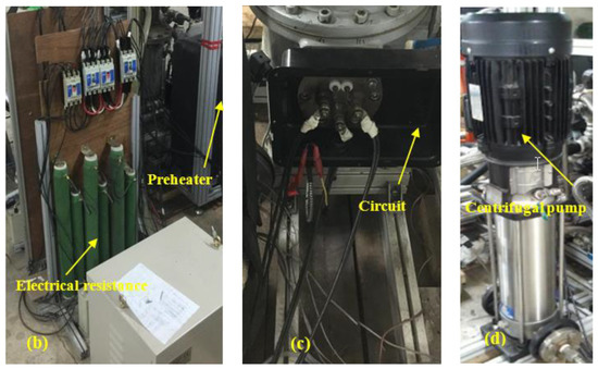 The pictures of (a) experimental setup; (b) the electrical load; (c) the circuit and (d) centrifugal pump.