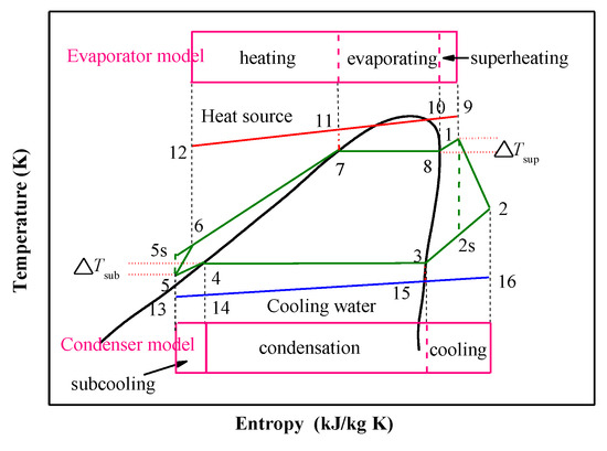 Figure 3 shows the T-s diagram of the ORC system, the expander isentropic efficiency is calculated based on the ideal expansion process and actual expansion process. The expander isentropic efficiency () and pressure difference () can be calculated as follows: