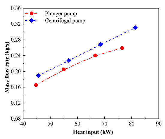 Mass flow rates with heat input using the plunger pump and centrifugal pump.
