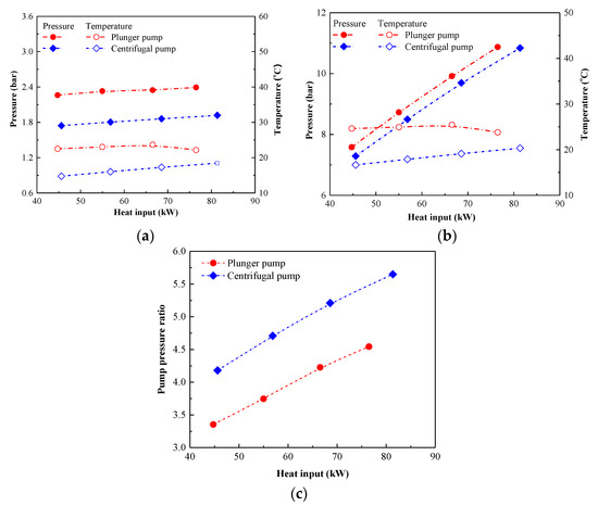 Figure 5 shows details of the temperature and pressure for the pump inlet and outlet with heat input using the plunger pump and centrifugal pump. In Figure 5a, the centrifugal pump inlet temperature and pressure have no obvious variation with the heat input. However, the plunger pump inlet temperature appears to suddenly decrease when the heat inputs exceed 66.53 kW, owing to the fluctuating environmental temperature. The environment temperature decreases slightly for heat inputs over 66.53 kW, resulting in a decrease of cooling water temperature and the pump inlet temperature. In Figure 5b, the pump outlet temperature has a similar trend to the state at the pump inlet, whereas the pump outlet pressure shows a sharp increase with the heat input. Because of the difficulty in repeating tests with similar environmental temperatures, the non-dimensional operating parameter (pump pressure ratio) is chosen to compare the characteristic of the two pumps, which is shown in Figure 5c. The centrifugal pump pressure ratio is much higher than the plunger pump. The pump outlet pressure for the plunger pump is in the range of 7.58–10.87 bar, which is 0.3 bar higher than that of the centrifugal pump ranging from 7.29 bar to 10.84 bar.