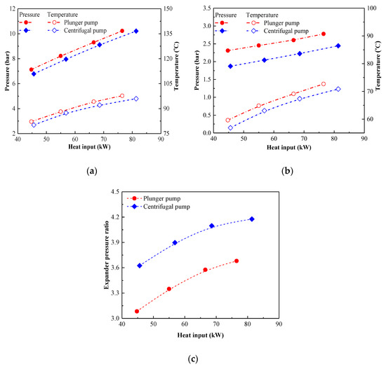 Figure 6 presents the comparison of expander inlet and outlet temperatures and pressure with heat input using the plunger pump and centrifugal pump. In Figure 6a, the expander inlet temperature and pressure increase monotonically with heat input. The expander inlet temperature of the plunger pump rises from 82.20 °C to 97.74 °C for heat inputs increasing from 45 kW to 85 kW, with the corresponding expander inlet pressure ranging from 7.13 bar to 10.23 bar. Meanwhile, the plunger pump demonstrates a higher expander inlet pressure and temperature than the centrifugal pump. The expander outlet pressure and temperature keep rising in Figure 6b, which is similar to that at the expander inlet. Similarly, in order to more clearly compare the features of the expander using the two pump systems, the pressure ratio for the expander is shown in Figure 6c. The expander pressure ratio in the system using the centrifugal pump is more favorable than that using the plunger pump because the centrifugal pump can provide higher pressure to the system.