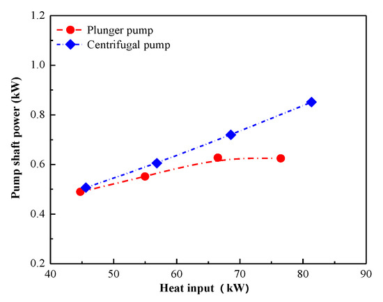 The pump shaft power cannot be tested and is expressed by Equation (8). Figure 7 demonstrates the details of shaft power using the plunger pump and centrifugal pump with heat input. Apparently, the pump shaft power of the centrifugal pump keeps increasing with heat input, which may be caused by the increase in mass flow rate and pump enthalpy difference. However, the shaft power of the plunger pump presents a slight decrease when heat inputs exceed 66.53 kW because of the higher sensitivity to the environmental temperature. The pump shaft power using the centrifugal pump increases from 0.51 kW to 0.85 kW, which is 37% higher than that of the plunger pump.