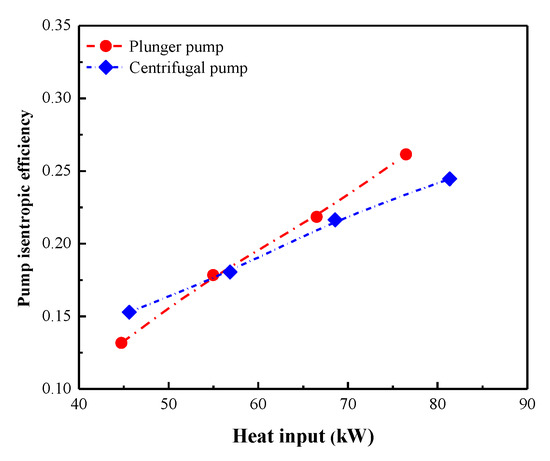 The pump isentropic efficiency can be considered as an important parameter to ascertain pump characteristics. Figure 8 displays the pump isentropic efficiency of the plunger pump and centrifugal pump. The isentropic efficiency keeps increasing with heat input because the pump compression process gets closer to the ideal isentropic process. The isentropic efficiency of the plunger pump and centrifugal pumps is in the range of 13.2–26.1% and 15.3–24.5%, respectively. The pump isentropic efficiency is really low because there is no specialized pump for the ORC system. Moreover, the centrifugal pump isentropic efficiency is higher than the plunger pump for low heat inputs, while a reverse trend for higher input heats. Meanwhile, the low pump isentropic efficiency reminds us that enhancing the pump’s behavior is vital for the improvement in ORC performance.