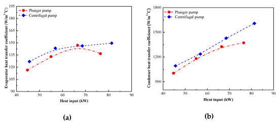 Evaporator and condenser heat transfer coefficients with heat input using the plunger pump and centrifugal pump: (a) evaporator heat transfer coefficients; (b) condenser heat transfer coefficients.