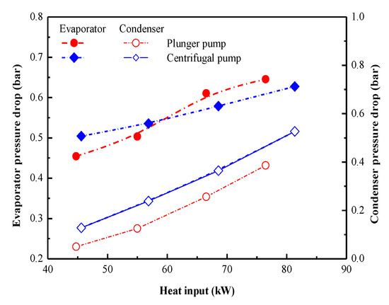 As for the ORC simulation, the pressure drop in the evaporation and condensation processes are usually ignored. However, for the actual cycle, having pressure drops can decrease the expander inlet pressure, and thus affect the overall system property. Figure 10 demonstrates the variation of condenser and evaporator pressure drop with heat input using the plunger pump and centrifugal pump. Obviously, the pressure drops for evaporator and condenser increase with the heat input, which may be caused by the increasing mass flow rate. A small difference in the evaporator pressure drop appeared between the plunger pump and the centrifugal pump. However, when the heat inputs raise from 40 kW to 82 kW, the condenser pressure drops using the centrifugal pump are 0.13–0.53 bar, which is 0.07 bar higher than that using the plunger pump. The evaporator pressure drops are in the range of 0.45–0.65 bar. It indicates that the pressure drop should be considered for the ORC simulation and decreasing the pressure drop is one way to improve the system performance.