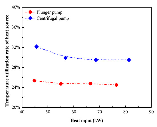 The variation of temperature utilization rate with heat input using the plunger pump and centrifugal pump is plotted in Figure 11. For a specific heat source temperature, a higher thermal efficiency does not represent a higher net power output. Therefore, the temperature utilization rate is used to appraise the heat source utilization. As illustrated in Figure 11, the temperature utilization rate for the centrifugal pump has a slight decrease whereas the plunger pump has almost no change with the heat input. The average heat source temperature utilization rate for the centrifugal pump is about 30%, which is 5% higher than that of the plunger pump, indicating that the centrifugal pump absorbs more heat than the plunger pump at the same heat source condition.