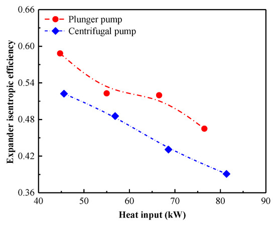 Figure 12 shows the expander isentropic efficiency with heat input using the plunger pump and centrifugal pump. It should be reminded that the scroll expander is designed with a nominal expander shaft power of 10 kW, indicating a heat input of 40–200 kW is needed. However, the heat input is set from 45 kW to 85 kW because of the power limitation. Therefore, the expander isentropic efficiency presents an apparent decrease trend from 58.8% to 39.1% with heat input because of the insufficient expansion. The expander isentropic efficiency for the plunger pump is in the range of 46.5–58.8%, which is 12.6% higher than that of the centrifugal pump.