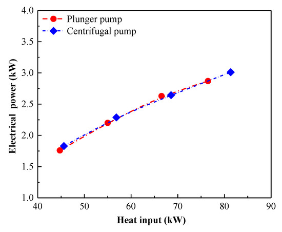 The variation of electrical power with heat input using the plunger pump and centrifugal pump is illustrated in Figure 13. The electrical power for the centrifugal pump rises from 1.83 kW to 3.01 kW, while that of the plunger pump is in the range of 1.76–2.87 kW. The reason is that the increment in pressure difference causes an increase in the expander rotational speed, resulting in an increase in electrical power. The electrical power has a small difference using the plunger pump and centrifugal pump, indicating that the electric power is insensitive on the pump types.