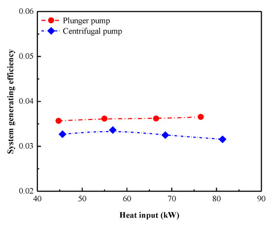 Figure 14 displays the system generating efficiency of the plunger pump and centrifugal pump. In this study, system generating efficiency is utilized as an evaluation criterion for this system, which is obtained based on the net electrical power and heat input. The system generating efficiency has no obvious change with heat input, demonstrating that the system generating efficiency has little effect on the heat input. The increasing net electrical power and the increasing heat input enable the almost unchanged system generating efficiency. The system generating efficiency for the plunger pump is approximately 3.63%, which is 12.51% higher than that of the centrifugal pump. One reason for the low overall system performance is that the pump consumed more power (as shown in Figure 7).
