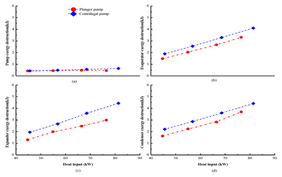 Exergy destruction of the four important components using the plunger pump and centrifugal pump: (a) pump exergy destruction; (b) evaporator exergy destruction; (c) expander exergy destruction; (d) condenser exergy destruction.