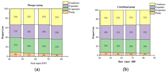 The proportion of exergy destruction for each component with heat input using the plunger pump and centrifugal pump: (a) the proportion of exergy destruction using the plunger pump; (b) the proportion of exergy destruction using the centrifugal pump.