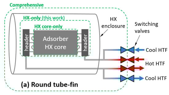 For simplicity, values in this work are reported for the HX-only control volume. The HX-only control volume includes the sorbent, metal, and HTF within the core and headers. It excludes the enclosure and any plumbing between the headers and the switching valves. In the case of a shell–tube or plate–shell HX, the headers and shell are typically inextricable, and have been excluded from the HX-only control volume.