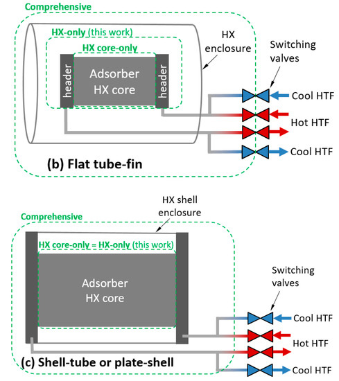 To apply these definitions to an adsorption HX, a control volume must be chosen. Three possible control volumes are depicted in Figure 1a,c for three classes of HX. The comprehensive control volume has the advantage of including all thermal masses expected to undergo a temperature change with each adsorption/desorption cycle, including HTF and plumbing between the HX and the switching valves, which is relevant to whole-system performance. However, the system is highly dependent on any particular implementation of an HX. In addition, many laboratory/experimental systems are not relevant to full systems because they are small-scale and lack a header or include instrumentation and other components within the comprehensive control volume, which would not be present in a commercial system.