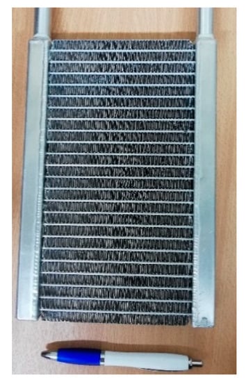 A custom-built sorption heat pump testbed was designed and used to study the performance of FAM-Z02-coated and -packed adsorber beds [12,15]. As shown in Figure 6, round tube–corrugated fin HXs, manufactured by Hayden Automotive, were chosen as the adsorber beds. The weight of the bare HX (mmat) was about 2.6 kg, consisting of 2.1 kg of copper tubes and 0.5 kg of aluminum fins. The internal volume of the HTF was 837 cm3, equivalent to 0.762 kg of silicon oil with density of 910 kg/m3 (at 30 °C) and heat capacity of 1.726 kJ1kg−1K−1 (at 30 °C). The volume of the adsorber bed loaded with sorbent was 4079 cm3, while the total volume of the adsorber bed was 5521 cm3.