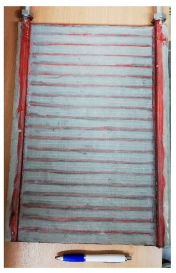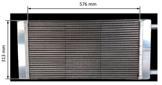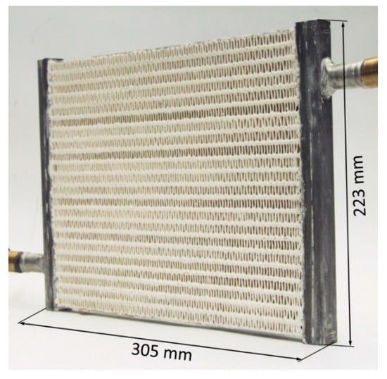Figure 5 shows a series of the flat tube–fin HXs coated with TiAPSO SCT-323 from Clariant AG, Bitterfeld, with binder SILRES MP 50 E from Wacker Chemie AG [33]. The HX without coating and flanges had a weight of 0.465 kg and was completely made of aluminum. The mass of the HTF (water) inside the flat tubes was 0.1 kg, and in the headers and the additional tubes was 0.15 kg.