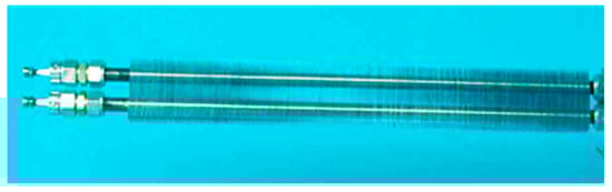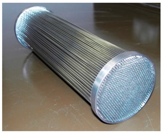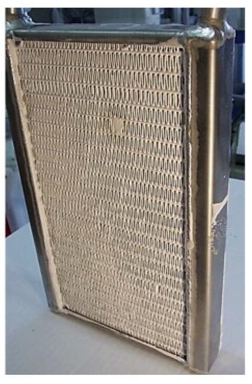 Figure 8 shows the core of a shell–microtube HX developed for a carbon-ammonia adsorption heat pump [35]. The unit was made from nickel-brazed stainless steel, with approximately 800 tubes that were 300 mm long, 1.2 mm in diameter, and 0.2 mm in wall thickness. The unit contained 1.12 kg of active carbon with a density of 750 kg m−3. The microtube design gave a good trade-off between short conduction path length in the active carbon for high power density and low TMtotal for high COP. The HX contained 1.71 kg of stainless steel (1.46 kg in the core and 0.25 kg in the headers) and 0.22 kg of water (0.12 kg in the tubes and 0.1 kg in the headers). The outer shell did not undergo thermal cycling and thus was excluded from the mass of the unit.