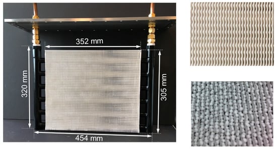 Figure 10 shows an HX with flat tubes and fibrous aluminum structures between the flat tubes. The fibrous structures are directly crystallized with SAPO-34 with the partial support transformation (PST) technique [37]. The fibrous structures are made of aluminum fibers sintered together, brazed onto the aluminum flat tubes and finally coated with adsorbent crystals [38]. The first experimental results for directly crystallized fibrous structures showed the potential of this approach to massively increase power density [39]. These findings were confirmed later at the scale of a complete adsorption module including a fiber HX [40]. The fibers had a mean diameter of approximately 130 µm. The mean thickness of the SAPO-34 crystallite layer was around 50 µm. The fibrous structures had a large volume-specific surface area, more than 7000 m²/m³. The total surface area of the fibers of this HX was approximately 41 m².