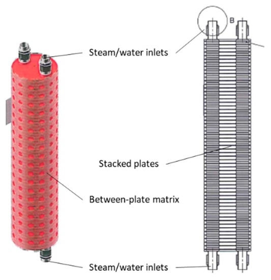 Figure 9 shows a core of a plate–shell HX for a halide salt-ammonia adsorption heat pump [36]. The HX incorporated a heat pipe, enabling high heat flux and full utilization of the contacting surface area with condensation heat transfer during heating desorption, and convection heat transfer during cooling adsorption.