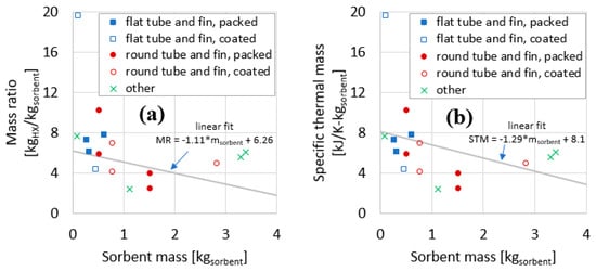 Mass ratio (a) and specific thermal mass (b) plotted against sorbent mass for the components evaluated in this work.