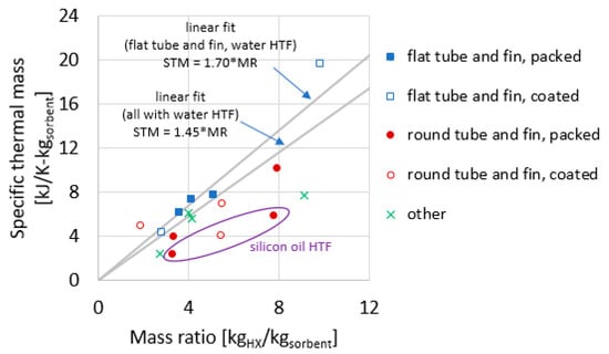Figure 12 plots STM as a function of MR. This relationship between STM and MR has a reduced dependence on HX size. Two linear fit lines are shown: one considering the five flat tube–fin adsorbers (all of which used water as the HTF), and another considering all 13 adsorbers with water as the HTF.