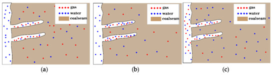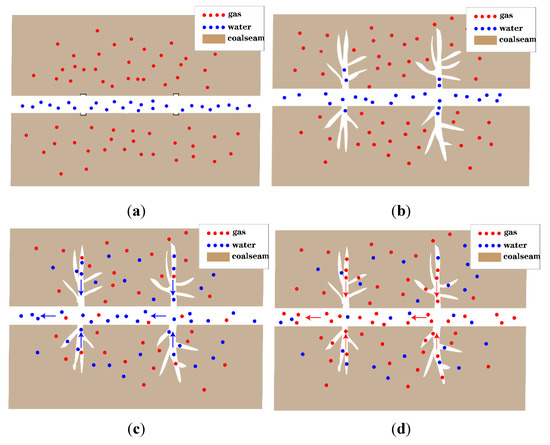 As shown in Figure 1, under the action of water pressure, the water environment is formed after the fractures penetrate, and the water entering the coal fractures continuously diffuses. Water molecules enter the main fracture network under injection pressure as shown in Figure 2a, and this process could be described by non-Darcy’s law. Water molecules Then enter the secondary fractures partly or mostly into micro-fractures as shown in Figure 2b. This process could be described by Darcy’s law. As water is continuously injected into the coal, the effect of water filtration will become increasingly apparent. When the filtered water enters the pores in the coal matrix of the body from the main or graded fractures or primary fractures in a diffused manner as shown in Figure 2c, the volume and permeability of the coal body will be changed. Water filtration will cause the coal to swell, affecting both the absolute permeability and relative permeability.