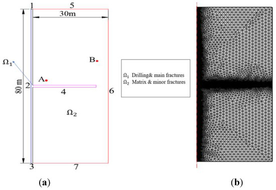 Considering that the borehole is symmetrical about the borehole axis in the coal seam and in order to reduce the number of grids, the simulation uses an axisymmetric planar two-dimensional model for calculation shown in Figure 3a. The geometric model had a length of 80 m and a width of 30 m; the radius of the borehole was 0.025 m. The main fracture width was 0.005 m and length was 19.95 m. The model was subjected to overburden gravity of 40 MPa, and the initial pore pressure was 1.2 MPa. The geometric model was meshed with a free-triangle mesh. The complete mesh, shown in Figure 3b, contains 66,025 domain elements and 5302 boundary elements. The average mesh quality is 0.9584 indicating a good mesh. Among them, boundaries 1, 2, 3, 4, 5, 6, and 7 are the corresponding boundaries of the calculation area, the rectangular area surrounded by boundaries 1 and 2 represents the borehole, and boundary 4 is marked with the main fracture.