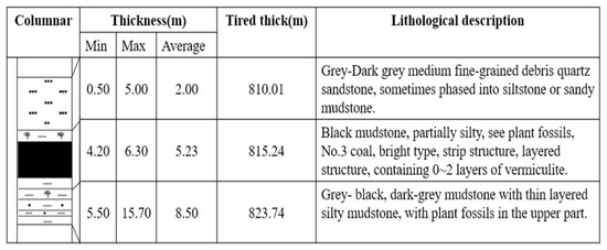 The test site is located at the 3308-working surface of Wangpo Mine. The average thickness of the working surface is 5.5 m, the coal seam inclination is 3°, the coal seam hardness is 0.7, the bedding is stable, the endogenous joint fractures are relatively developed, and the local coal is soft and broken. The gas content is 12 to 14 m³ /t, and the gas pressure is 1.2 MPa. The roof consists of a basic roof of 8.89 m-thick medium sandstone, a direct roof of 4 m thick sandy mudstone, and a pseudo roof of 0.3-m thick carbonaceous mudstone. The floor consists of a direct bottom of 2.1 m thick mudstone or fine sandstone with a thickness of 3.2 m shown in Figure 4.