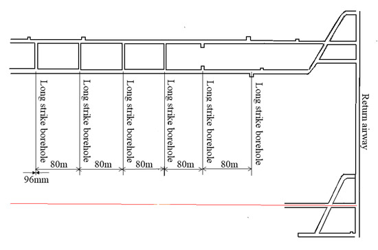 In order to improve the gas drainage efficiency, the 3308 working surface was transported along the trough to the 3308 working surface coal seam for drilling and hydraulic fracturing. The designed hole depth was 250 m and the hole diameter was 96 mm. Five fracturing boreholes at intervals of 80 m were evenly arranged as shown in Figure 5. From 21 December 2018 to 30 January 2019, hydraulic fracturing was performed on the coal seam of 3308 working surface in Wangpo Coal Mine. Packers with a pressure capacity of 40 MPa were used to perform three-stage fracturing of the borehole. Five holes with the final depth of each borehole were between 246 and 257 m, and the packers are located at 160, 85, and 25 m from the tunnel. The starting pressure of the fracturing sections is 19.1 to 26.3 MPa. During the fracturing process, the holding pressure was 20 MPa, the holding time was 10 h, and the water injection volume in the fracturing section was between 103.74 and 119.3 m3.